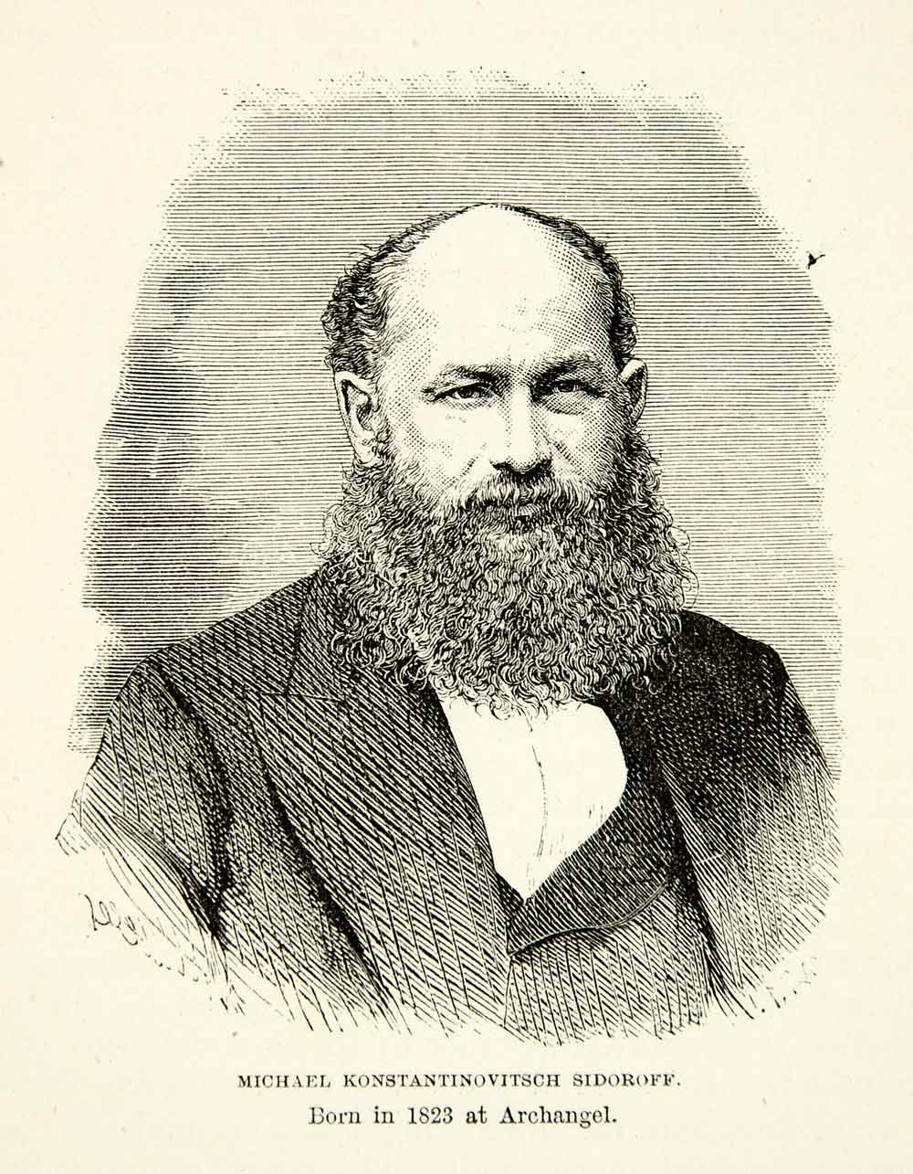 This is an original 1882 black and white in-text wood engraving of a portrait of Russian arctic explorer, Michael Konstantinovitsch Sidoroff.