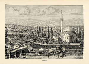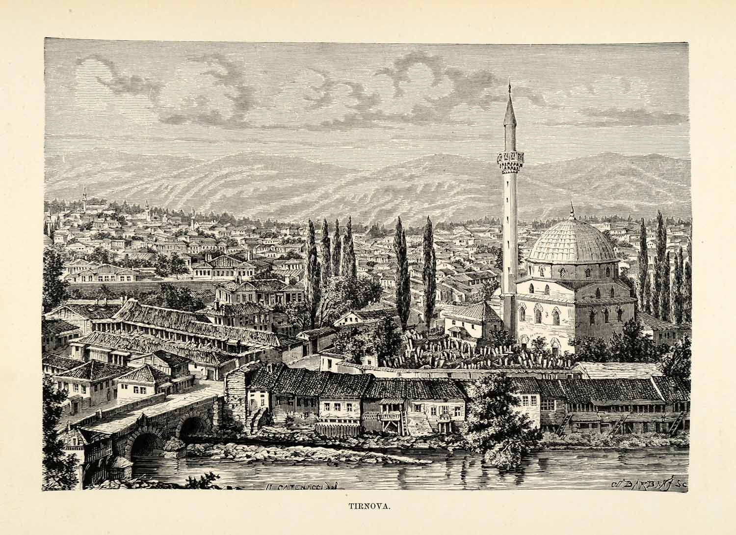 This is an original 1882 black and white wood engraving of the city of Tirnova (Veliko Tarnovo), Bulgaria.