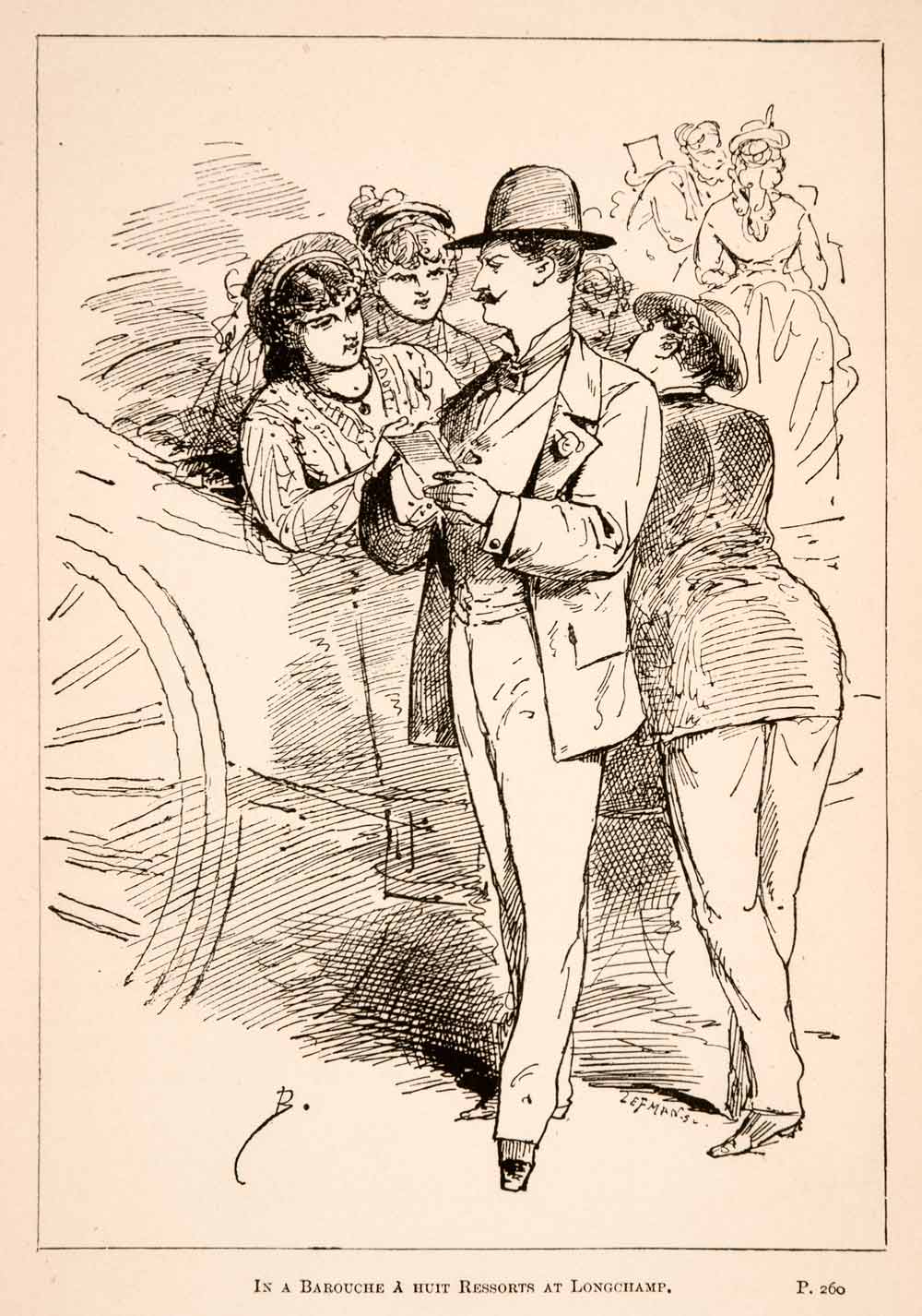 This is an original 1882 black and white wood engraving of two Parisian gentleman chatting up some fine ladies riding in a
