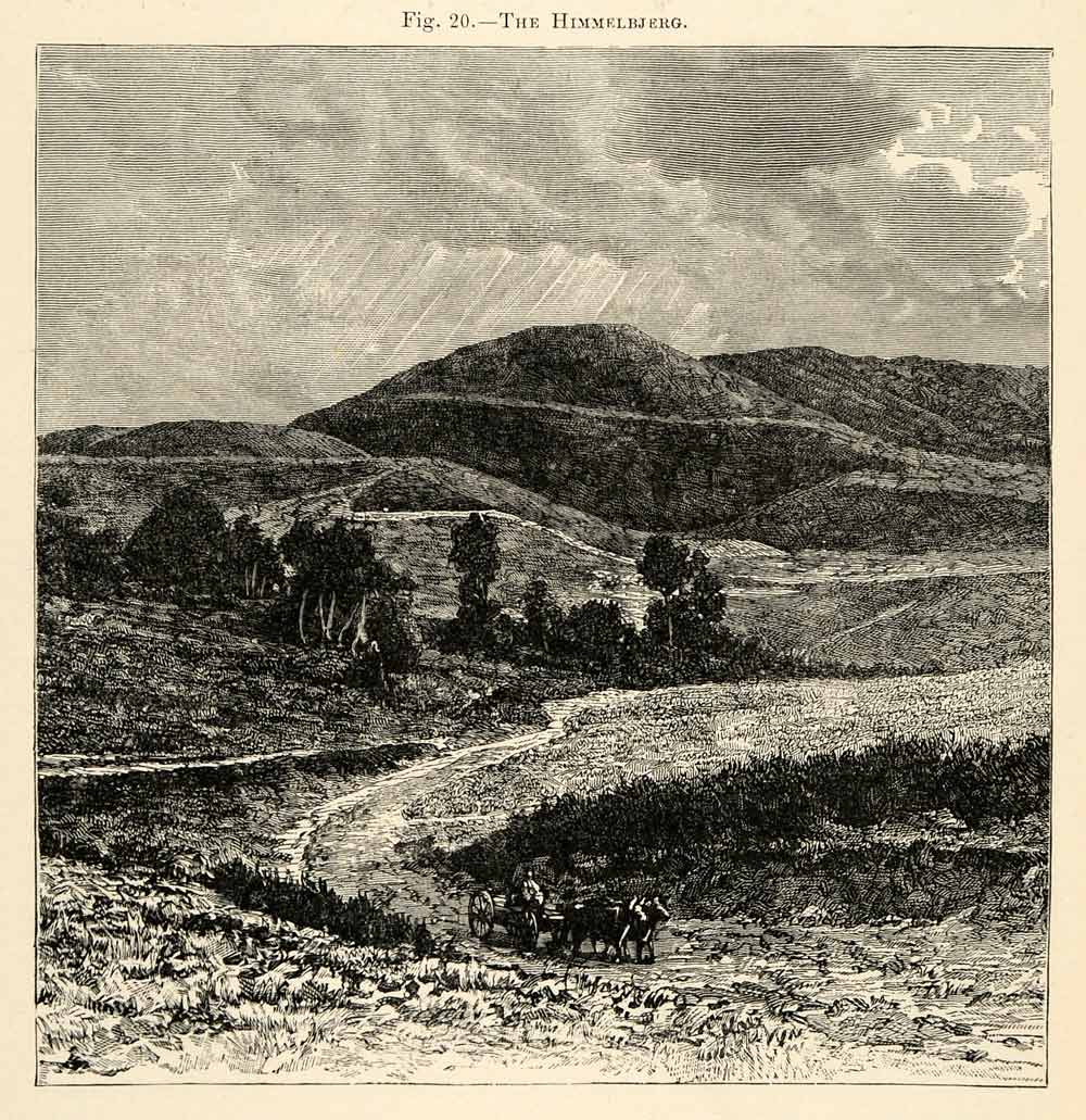 This is an original 1882 monochrome wood engraving of the Himmelbjerg in Denmark. The Himmelbjerg was once considered to be the highest peak in Denmark, but is only 126 meters above the level of the lake in the valley.