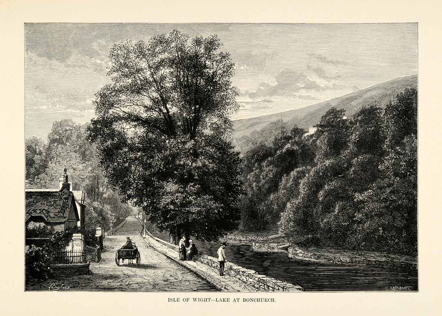 This is an original 1882 black and white wood engraving of the lake at Bonchurch on the Isle of Wight, located near Hampshire, England.