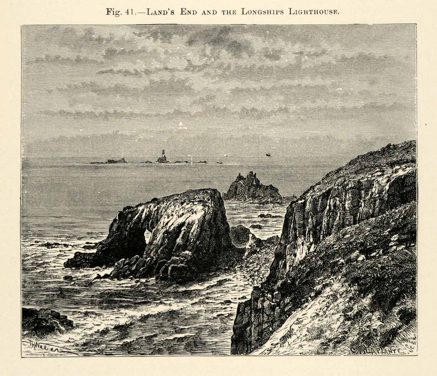 This is an original 1882 black and white wood engraving of the coast of Land's End, Cornwall, United Kingdom. Seen are the rock islets of the area known as "Longships."