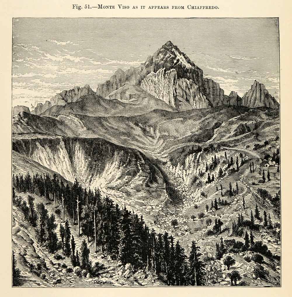 This is an original 1882 monochrome wood engraving of Monte Viso.