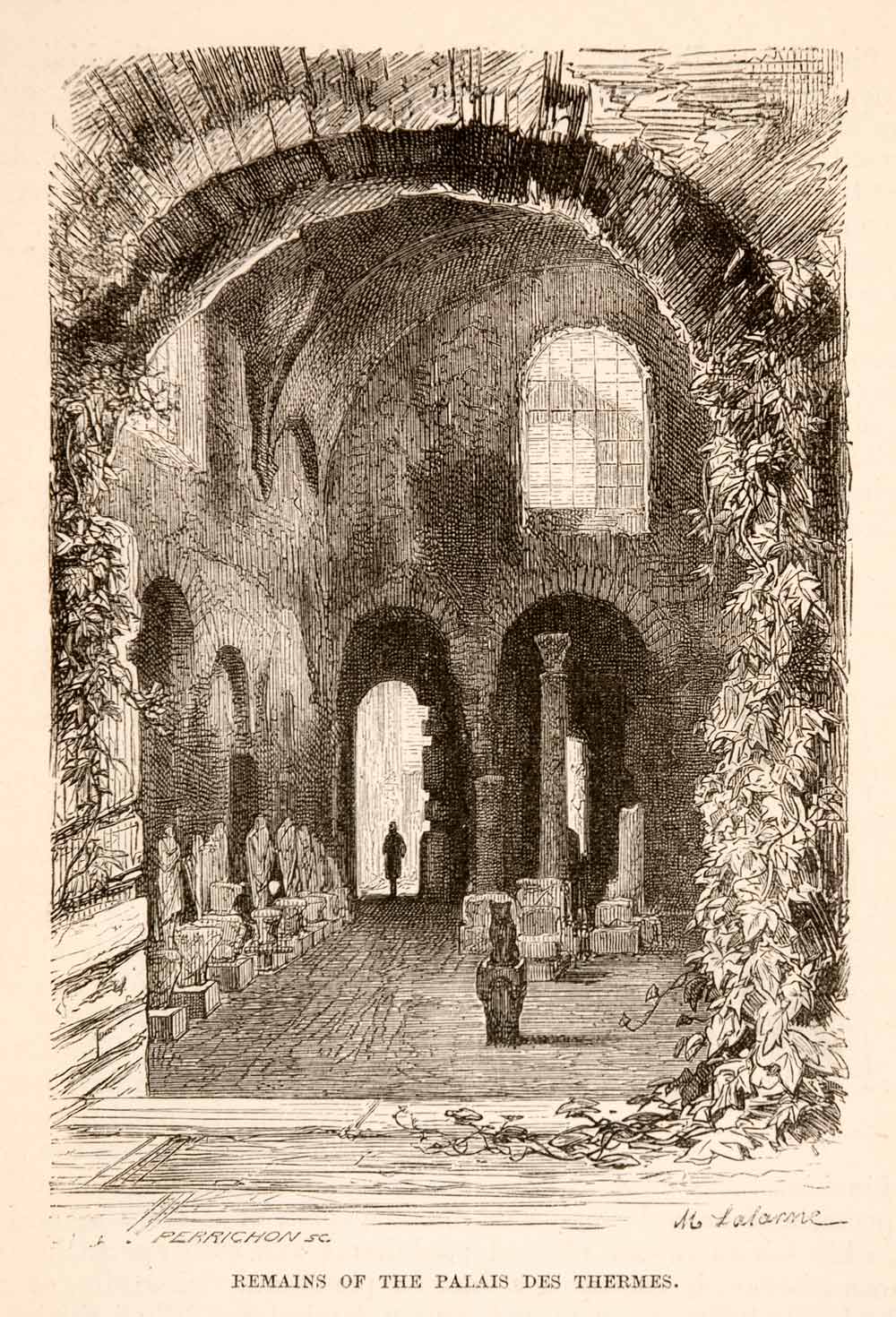 This is an original 1882 black and white in-text wood engraving of the remains of the Palais des Thermes, the oldest building built partially of brick in Paris, France, dating back to the 2nd or 3rd century.