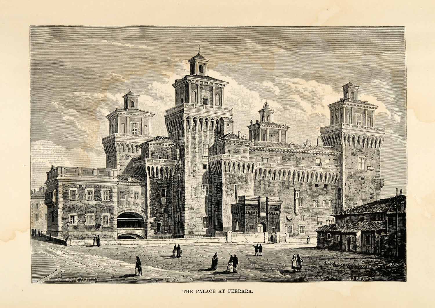 This is an original 1882 black and white wood engraving of the Palazzo dei Diamanti in Ferrara, Italy, which continues to stand as one of the most influential examples of European Renaissance architecture. This historic structure was first erected around the late 1400s and served as a residence for the Este and later the Villa marquees. In 1832, the palace housed the National Gallery of Art and the Civic University.
