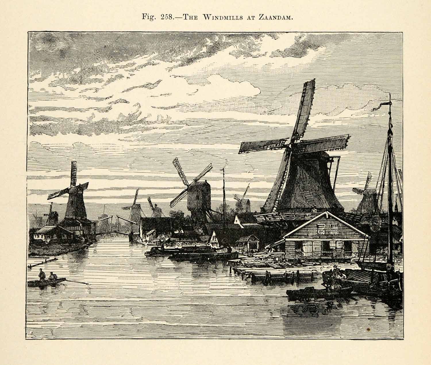 This is an original 1882 monochrome wood engraving of the multiple windmills at Zaandam in the Netherlands. They were the reason why the town was such a successful lumber port, which ultimately lead to it being on the forefront of the first Industrial Revolution.