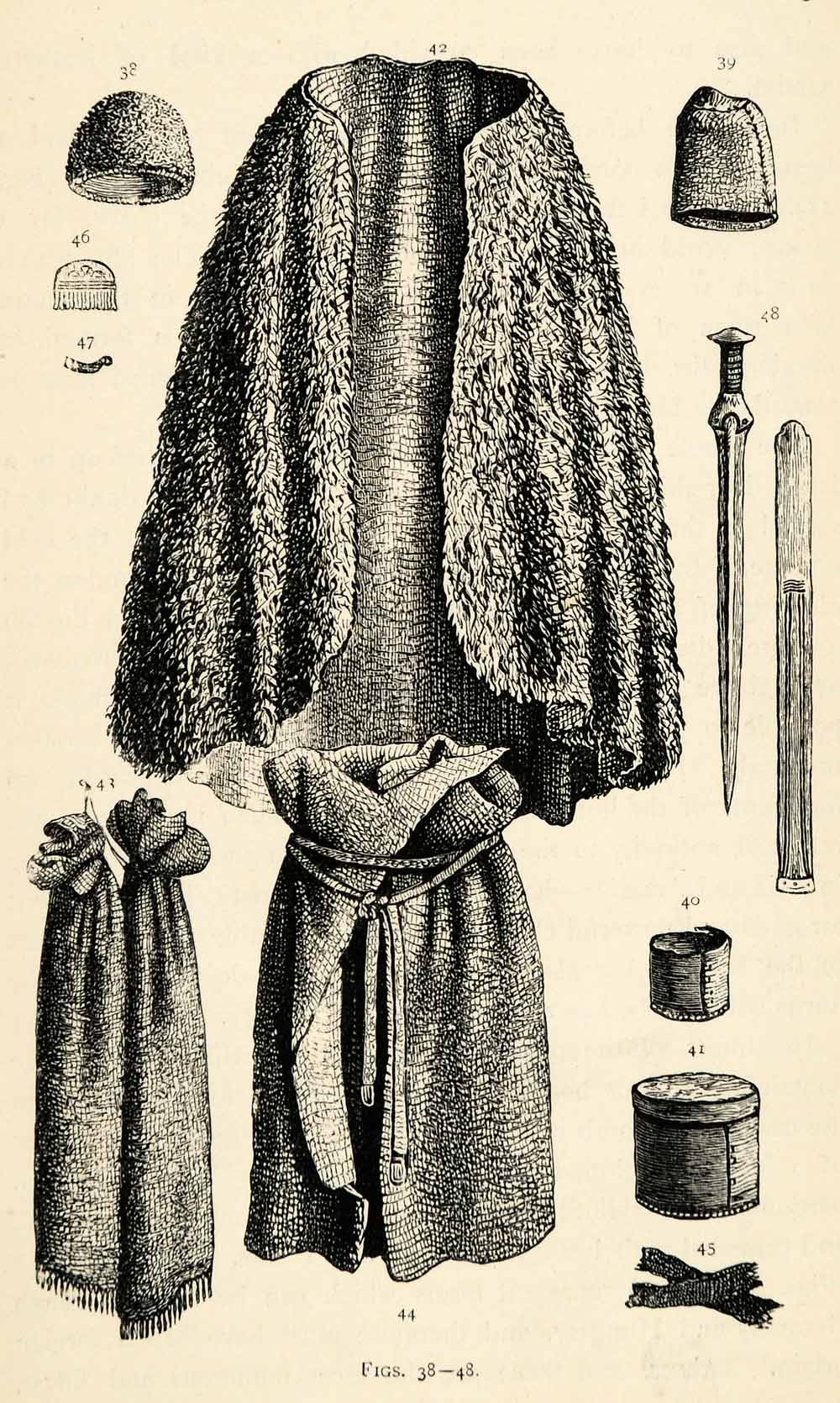 This is an original 1882 black and white woodcut of various prehistoric articles including a cap, cloak, and clothing that were found in a grave at Treenhöi, in Juntland.