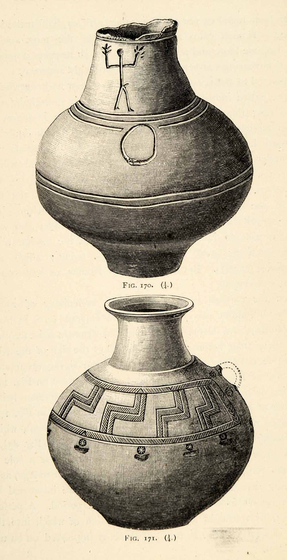 This is an original 1882 black and white woodcut of two earthen vessels with symbolical ornament from the earlier Iron Age found in Denmark.