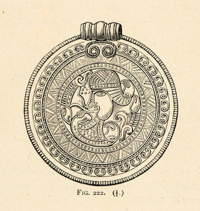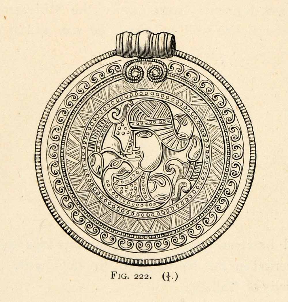 This is an original 1882 black and white woodcut of a gold bracteates from the middle Iron Age found in Denmark.