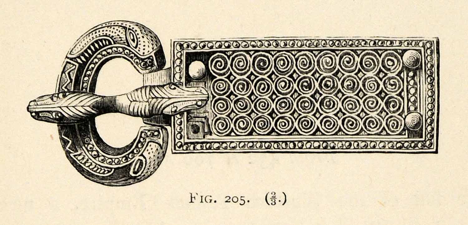 This is an original 1882 black and white woodcut of a silver buckle with gold mounts from the earlier Iron Age found in Denmark.