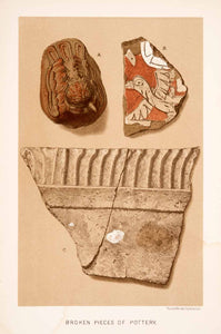This is an original 1883 color chromolithograph of broken orange pottery pieces from ancient Aztec cities. Orange pottery was distinctive of the area in that time.