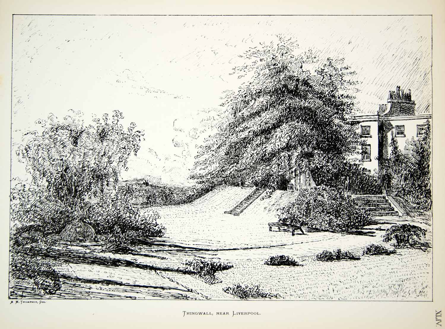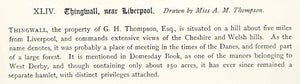 This is an original 1883 black and white lithograph of a drawing by A.M. Thompson of Thingwall Hall in the village of Thingwall on the Wirral Peninsula of England, United Kingdom. The house was built in 1849 by Liverpool merchant G.H. Thompson, Esq. on an estate of about 150 acres.