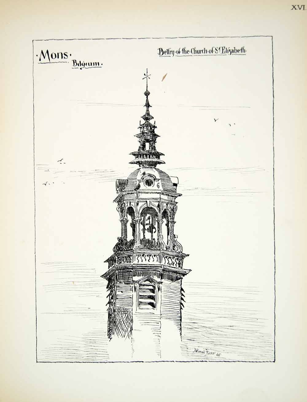 This is an original 1883 black and white lithograph of a drawing by John W. Small of the belfry tower of the Church of St. Elizabeth in the city of Mons, Belgium.