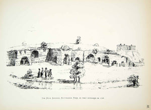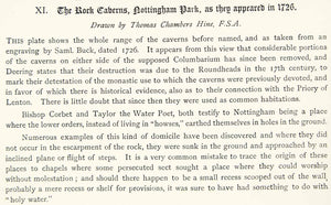 This is an original 1883 black and white lithograph of a drawing by Thomas Chambers Hine of the red sandstone rock caverns in Nottingham Park, England, United Kingdom as they appeared in 1726 CE.