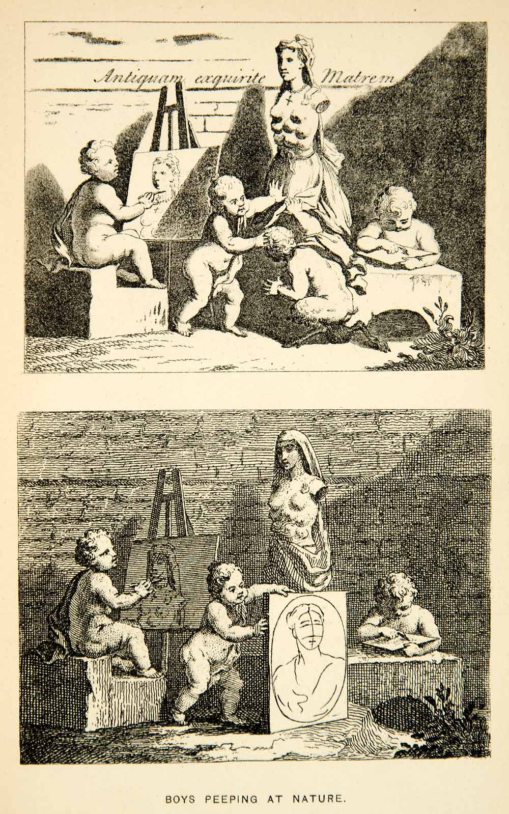 This is an original 1883 photolithograph of a painting by William Hogarth (1697-1794) entitled "Boys Peeping at Nature" that portrayed a group of putti drawing the statue of Diana Multimammia.