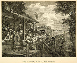 This is an original 1883 photolithograph of "The Polling", the third in a series of four paintings by William Hogarth (1697-1764) entitled "The Humours of an Election" that portrayed English voters lining up at the ballot boxes to cast their support for the Whig and Tory political parties.