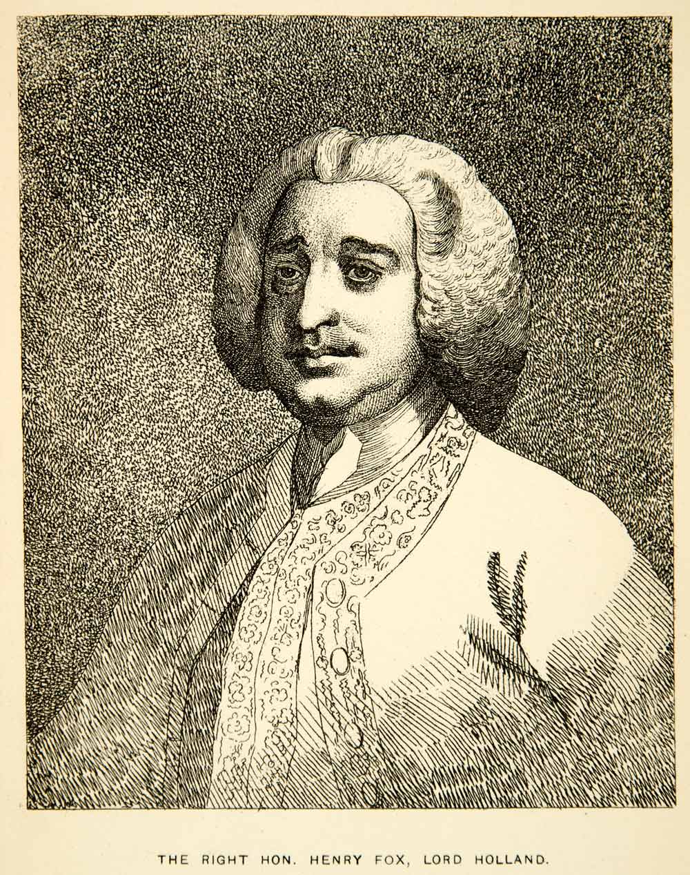 This is an original 1883 black and white photolithograph of a painting by William Hogarth (1607-1764) that portrayed British Whig politician, Henry Fox, 1st Baron Holland (1705-1774) during the Georgian era.