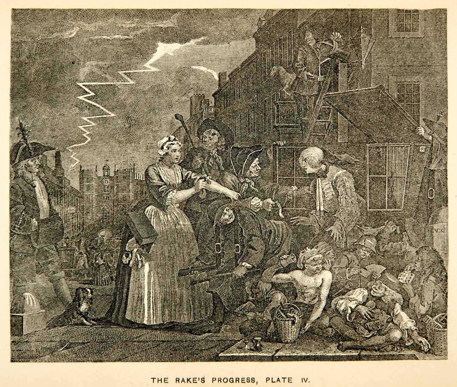 This is an original 1883 photolithograph of "Arrested for Debt", the fourth in a series of eight paintings by William Hogarth (1697-1764) entitled "A Rake's Progress" or "The Rake's Progress" that portrayed spendthrift Tom Rakewell narrowly escaping arrest for debt by Welsh bailiffs.