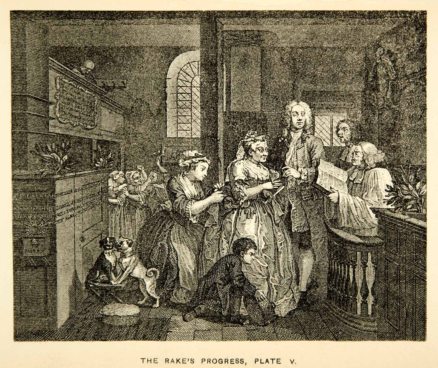 This is an original 1883 photolithograph of "Married to an Old Maid", the fifth in a series of eight paintings by William Hogarth (1697-1764) entitled "A Rake's Progress" or "The Rake's Progress" that portrayed the wedding ceremony of "spendthrift" Tom Rakewell to St Marylebone.