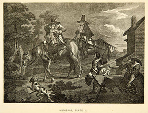 This is an original 1883 black and white photolithograph of "Sr. Hudibras, his passing Worth", the second in a series of twelve engravings by William Hogarth (1697-1764) that illustrated Samuel Butler's mock heroic narrative poem entitled, "Hudibras". This piece depicts Sir Hudibras and his squire Ralpho embarking on a Holy Crusade