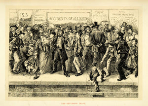 This is an original 1883 black and white tipped-in wood engraving of a bustling train station. In addition to a small boy smoking a pipe, there is a mother desperately trying to reign in her wandering children and an old man trying to purchase a paper from a small child scrambling up the steps. The caption simple reads "The Excursion Train."