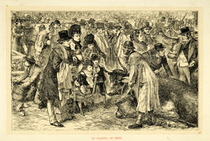 This is an original 1883 black and white tipped-in wood engraving of an elegant Victorian family perusing the stock down at the local market, a very serious task indeed. The caption reads "The Search of Beef."