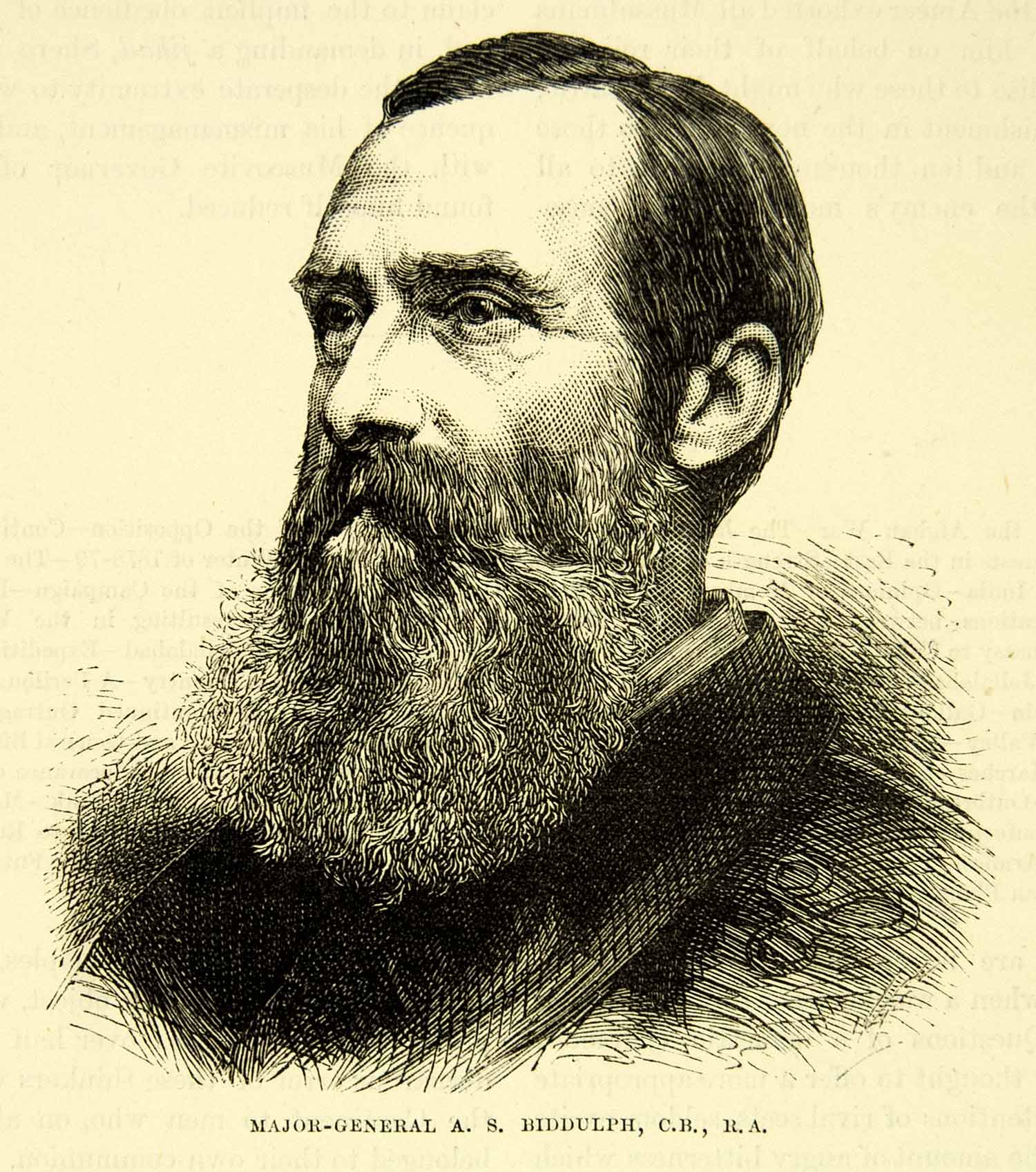 This is an original 1883 black and white in-text wood engraving of a portrait of Major-General A. S. Biddulph.