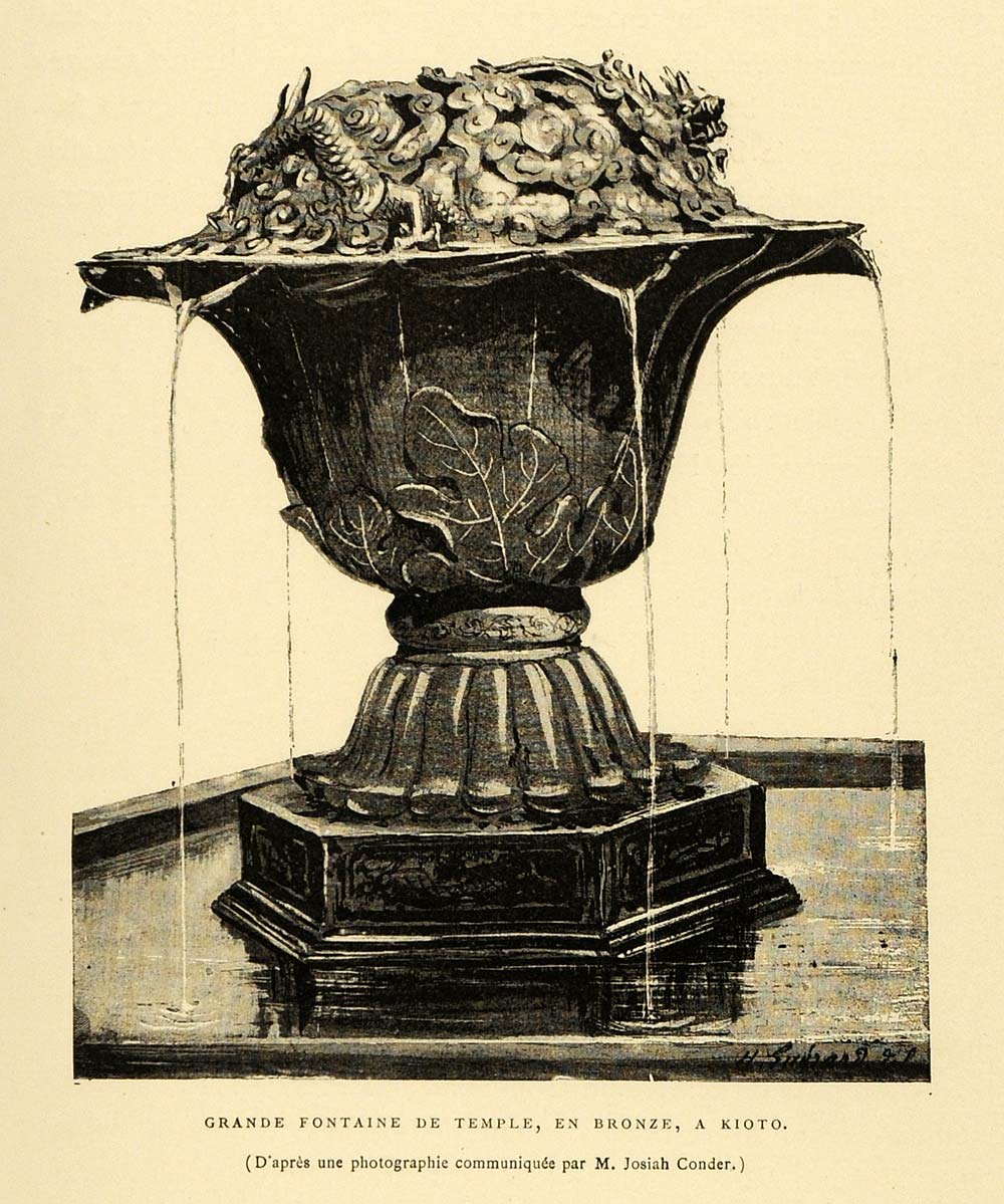 1883 Wood Engraving Fountain Kyoto Temple Japanese Architecture Dragon LAJ1