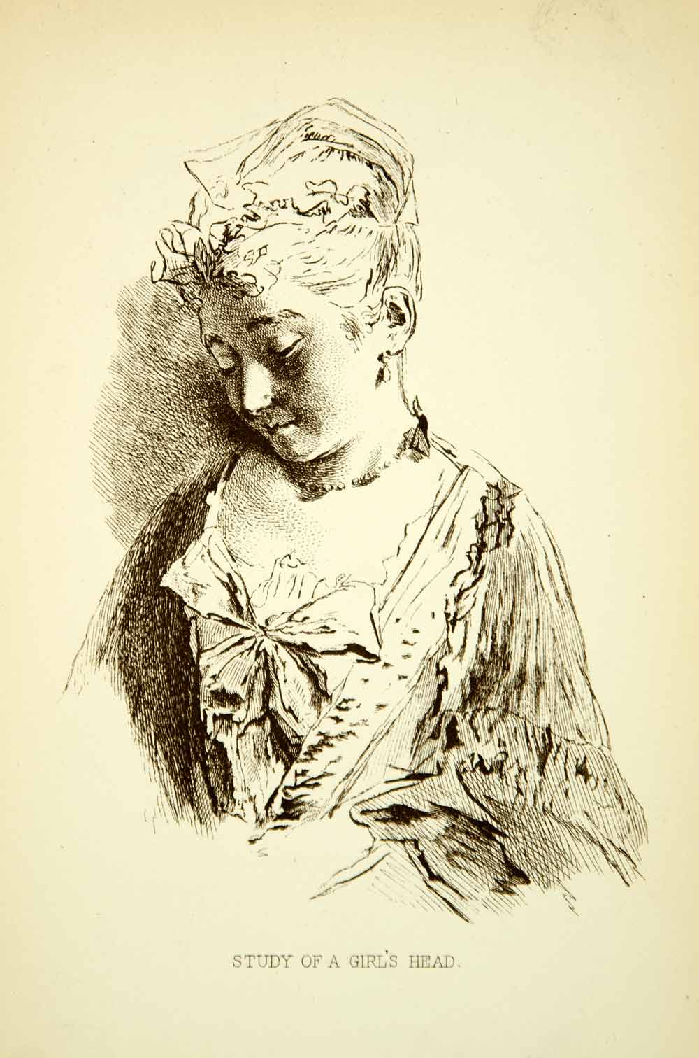 This is an original 1883 black and white wood engraving of a Rococo painting by Jean-Antoine Watteau entitled "Study of a Girl's Head".
