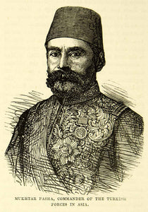 This is an original 1883 black and white in-text wood engraving of Mukhtar Pasha, the commander of the Turkish forces in the Asian Theater during the Russo-Turkish War.