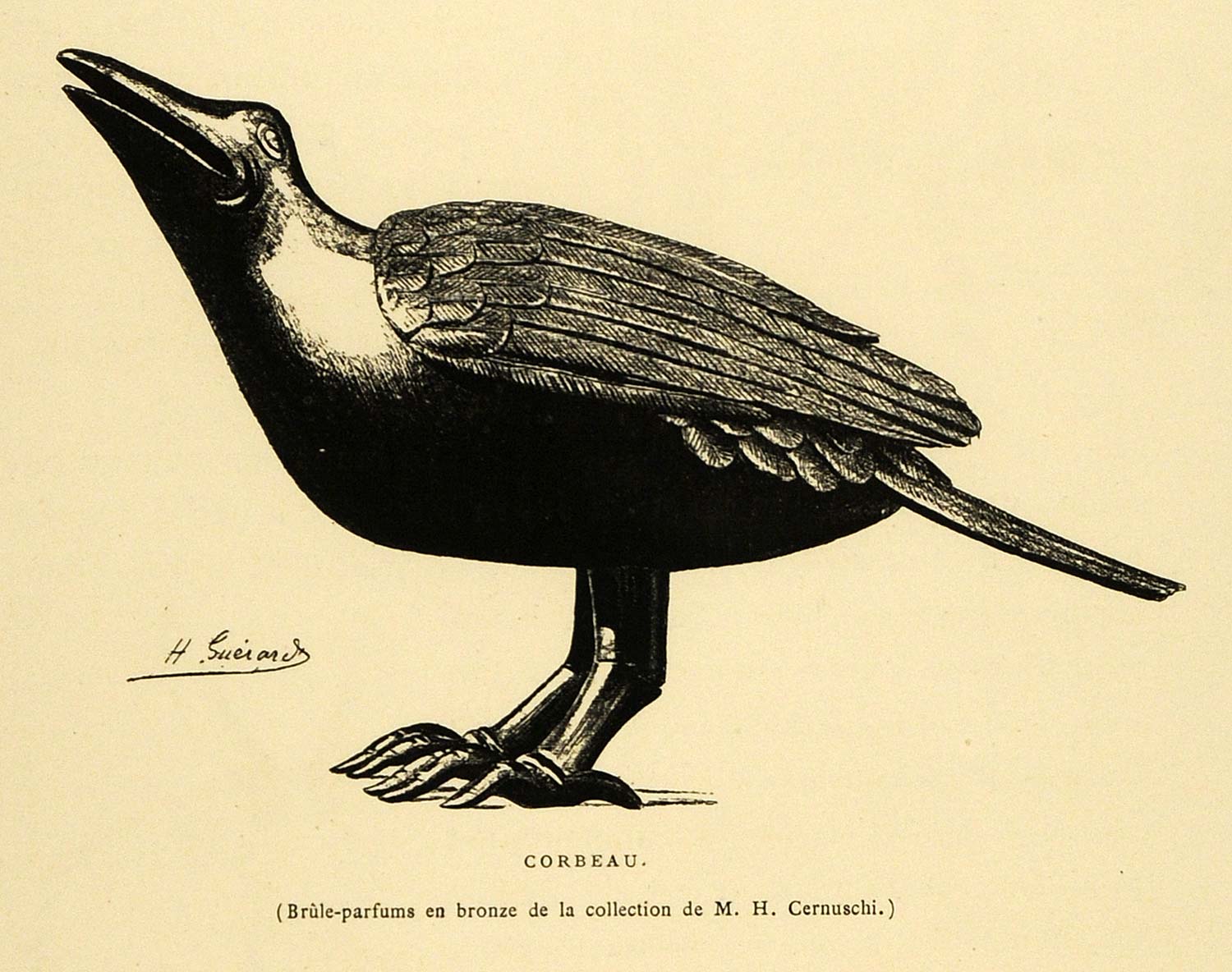 1883 Wood Engraving Raven Crow Incense Burner Japanese Henri Guerard Edo LAJ1