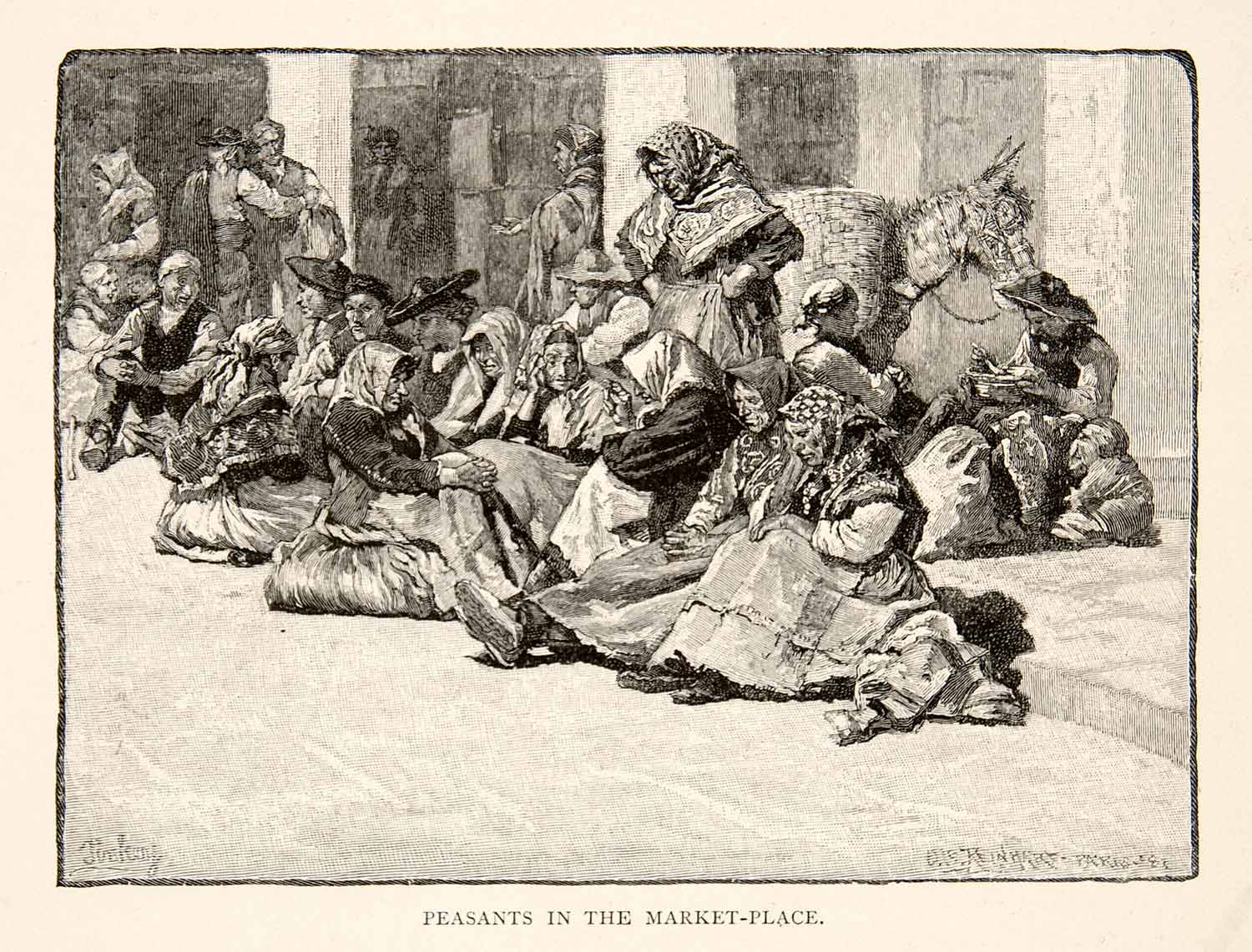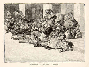 1883 Wood Engraving Spain Peasants Marketplace Art Donkey Poverty Costume XGXB1