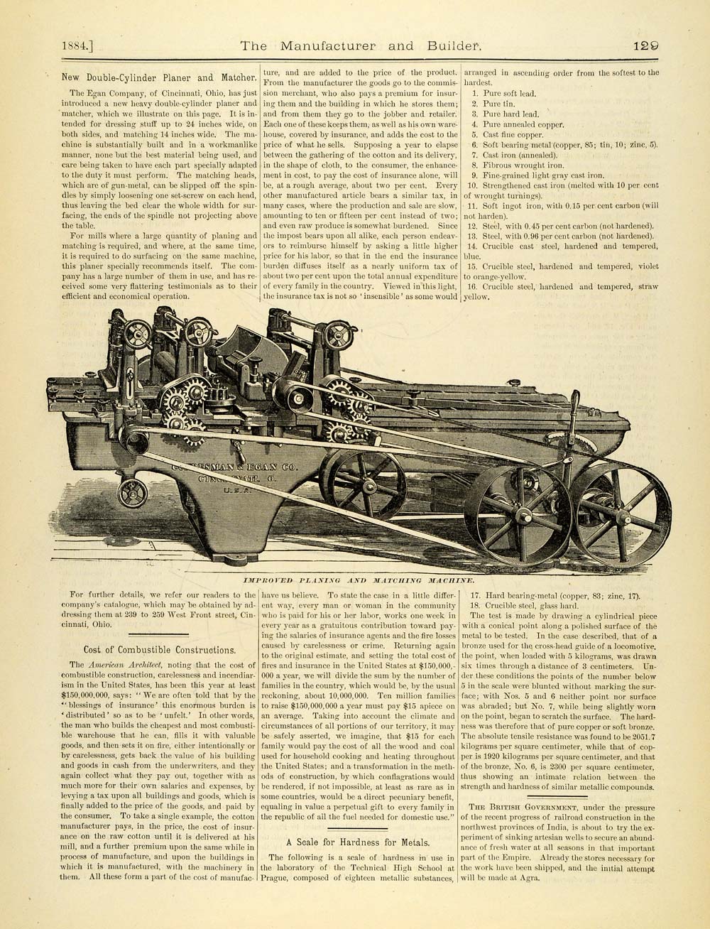 This is an original 1884 half-page article about the new Double-Cylinder Planer and Matcher for millwork, manufactured by the Egan Company, 239 to 259 West Front Street, Cincinnati, Ohio.