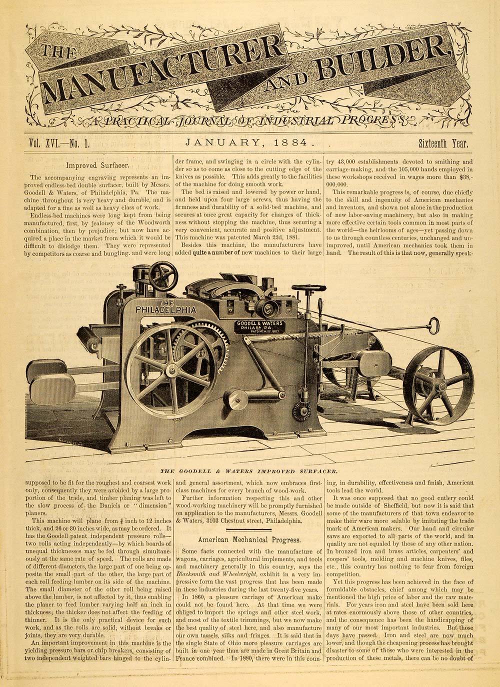 This is an original 1884 one-page article about an improved surfacer for lumber-- the Goodell & Waters Endless-Bed Double Surfacer, built by Goodell & Waters, 3103 Chestnut Street, Philadelphia.