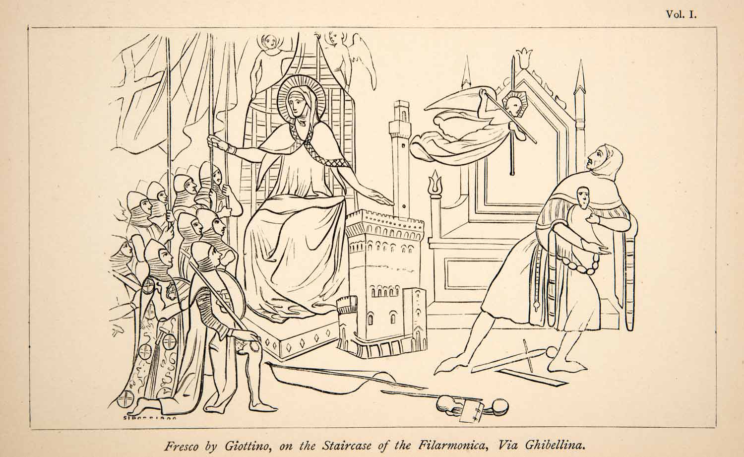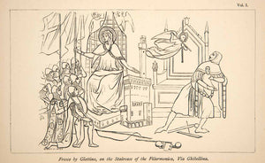 This is an original 1884 black and white wood engraving of a fresco by Giottino (1324-1369) who was an Italian painter from Florence, Italy. He was born Tommaso di Stefano. He learned to paint from his father and studied the works of the master painter Giotto. Giottino was named after Giotto since his style was similar to the master's.