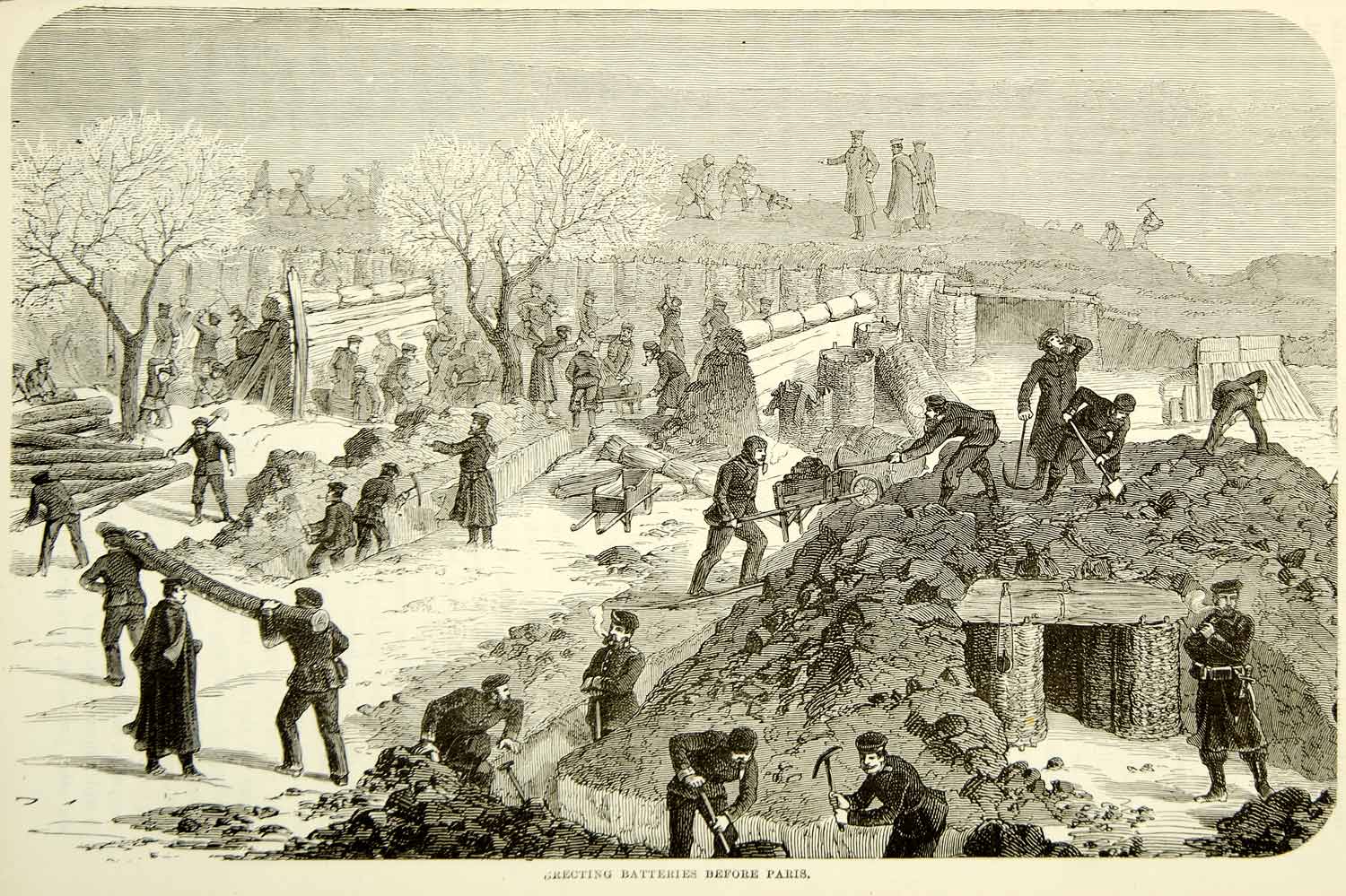 Keywords specific to this image: Europe, Military, Engineers, Troops, Infantry, Soldiers, Army, Entrenchment, Earthworks, Officer, Dig, Tunnel, Log, Lumber, Pickax, Shovel, Wheelbarrow, Tools, Franco-German War, Garrison