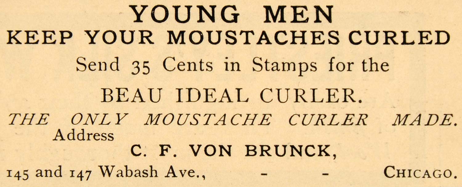 This is an original 1885 black and white print ad for the only moustache curler made-- The Beau Ideal Curler. C. F. Von Brunck., 145 and 147 Wabash Avenue, Chicago.