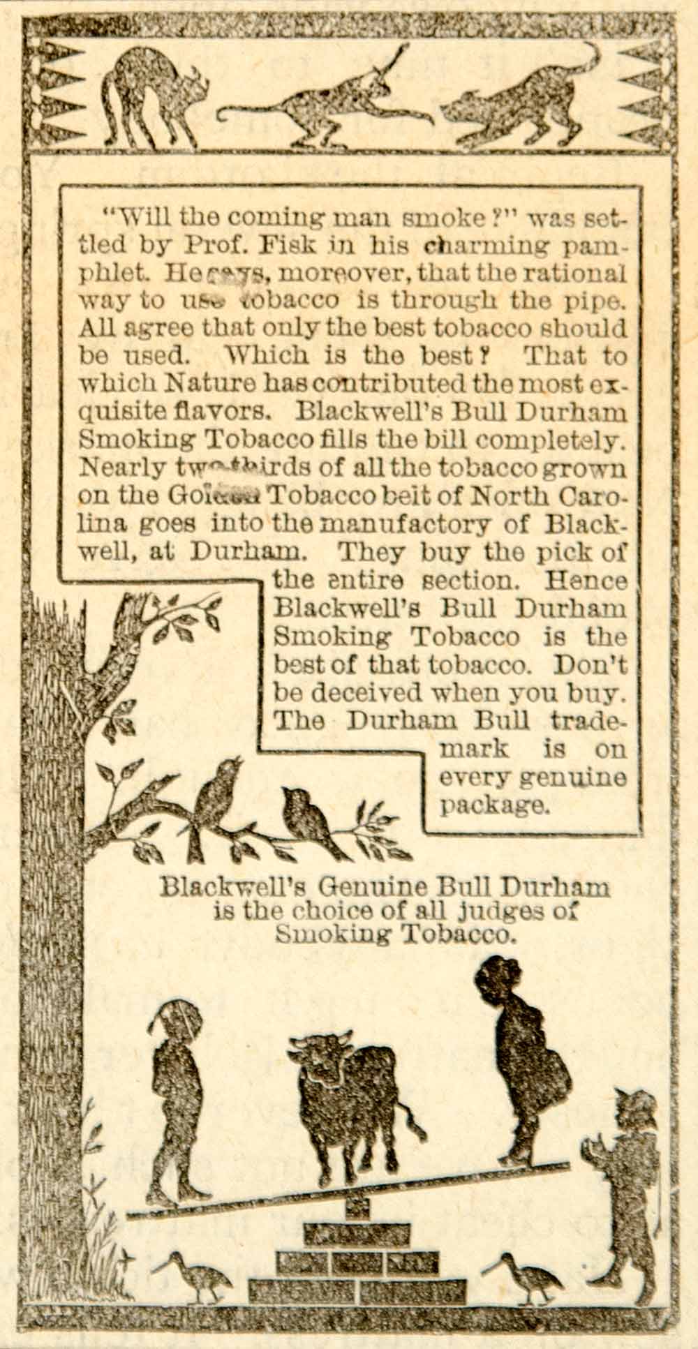 This is an original 1885 black and white print ad for Blackwell's Genuine Bull Durham Smoking Tobacco grown in the "Golden Tobacco BeltÓ of North Carolina.