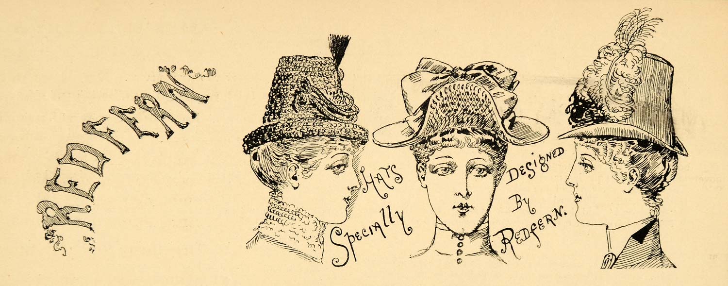 This is an original 1885 black and white print ad for Redfern, 210 Fifth Avenue, New York (next to Delmonico's). A varied stock of ladies' hats in the newest fashions.