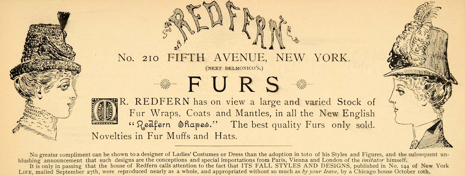 This is an original 1885 black and white print ad for Redfern, 210 Fifth Avenue, New York (next to Delmonico's). A varied stock of ladies' fur wraps, coats, hats, muffs, and mantles.