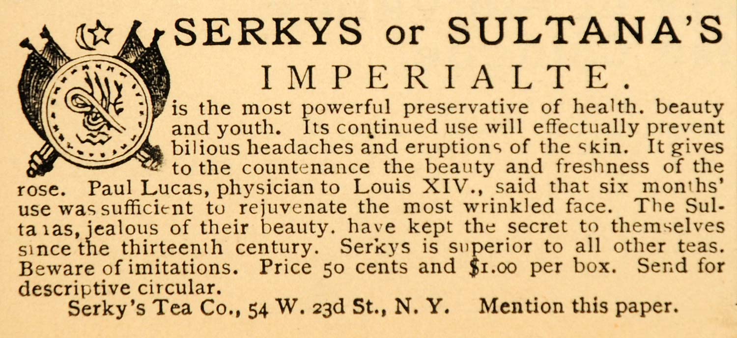 This is an original 1885 black and white print ad for Serky's or Sultana's Imperialte Tea, the "most powerful preservative of health, beauty, and youth." Paul Lucas, physician to Louis XIV, endorsed the tea for curing face wrinkles. Serky's Tea Company, 54 West 23rd Street, New York.