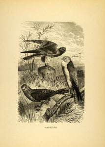This is an original 1885 black and white lithograph of the Harriers, a diurnal hawks belonging to the birds of prey in the Accipitridae family.