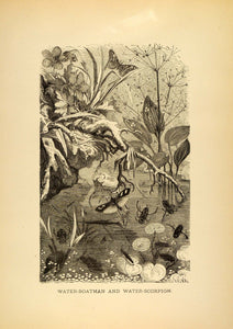 This is an original 1885 black and white lithograph of various species including the Water Boatman, and the Water Scorpion. The Water Boatman, also known as Backswimmers, is an herbivorous insect. The Water Scopion is also known as the Nepidae, needle bugs, or water sticks, an insect in the Nepidae family of the order Hemiptera.