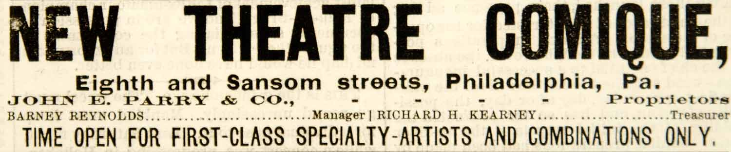1886 Ad Theatre Comique Barney Reynolds Vaudeville Theatrical Philadelphia YNY1