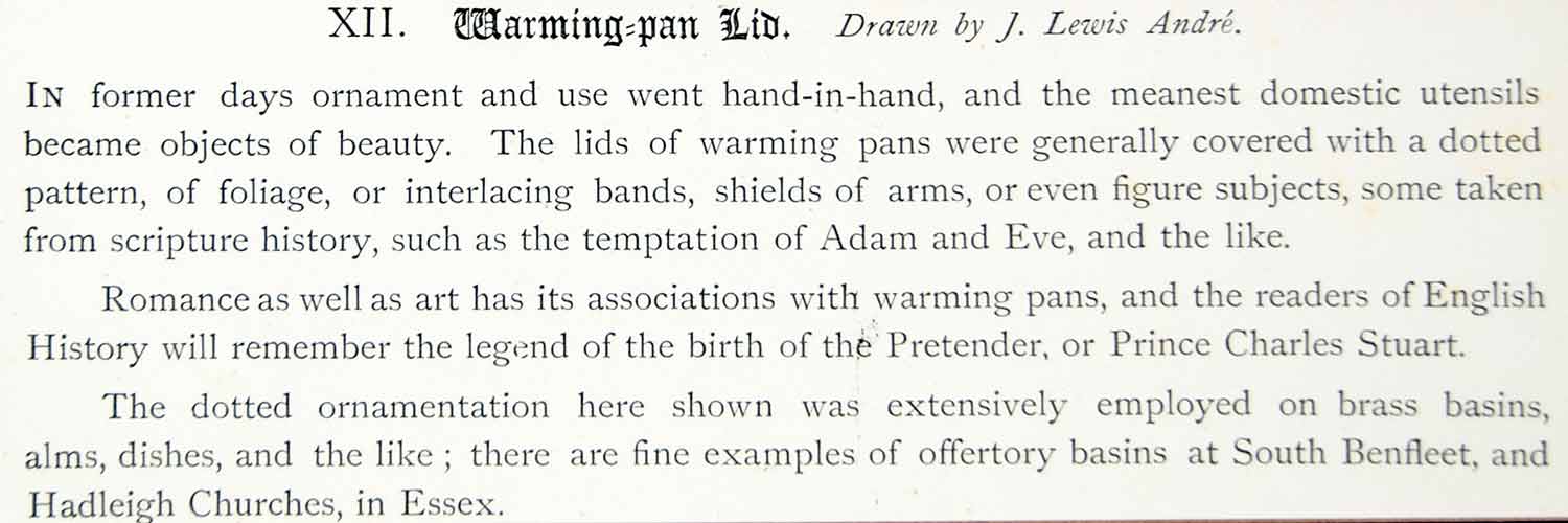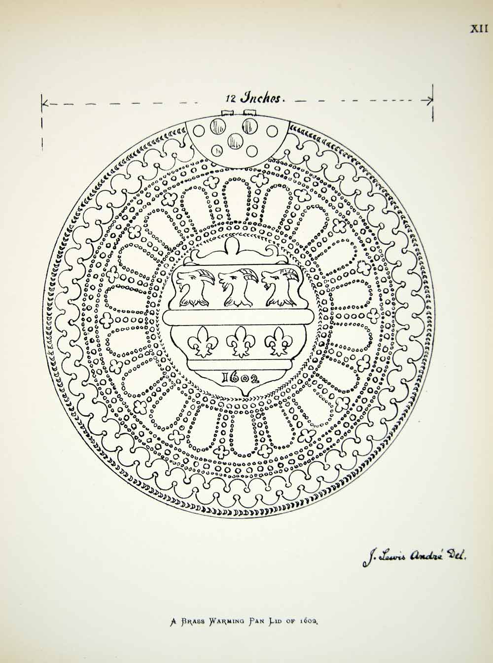 This is an original 1886 black and white lithograph of a drawing by J. Lewis André of a brass, 17th century English warming pan lid.