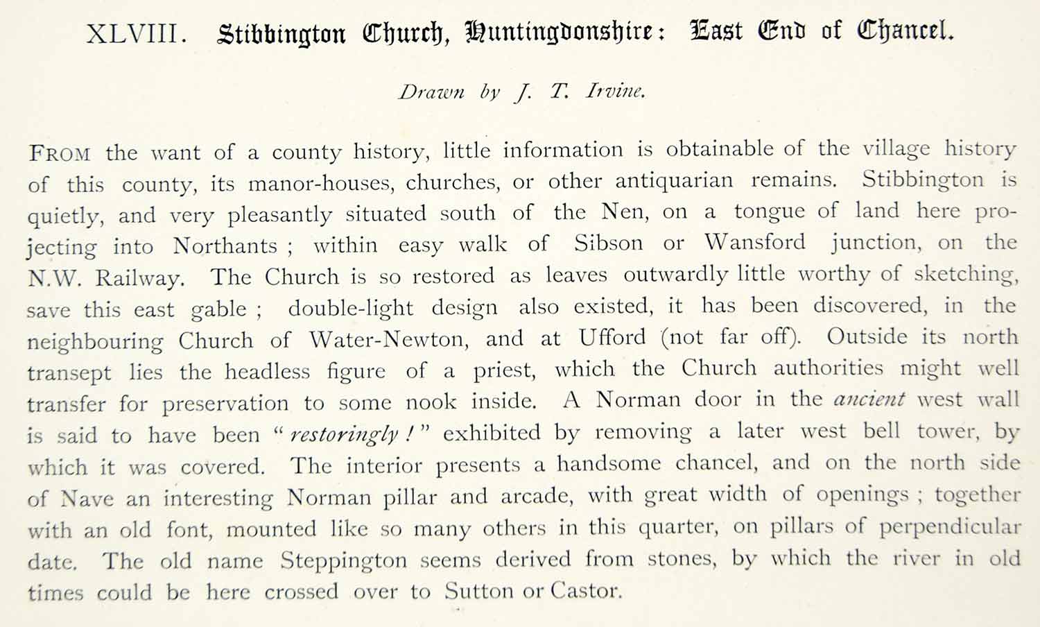 This is an original 1886 black and white lithograph of a drawing by James Thomas Irvine of Stibbington Church in Cambridgeshire, England, United Kingdom.