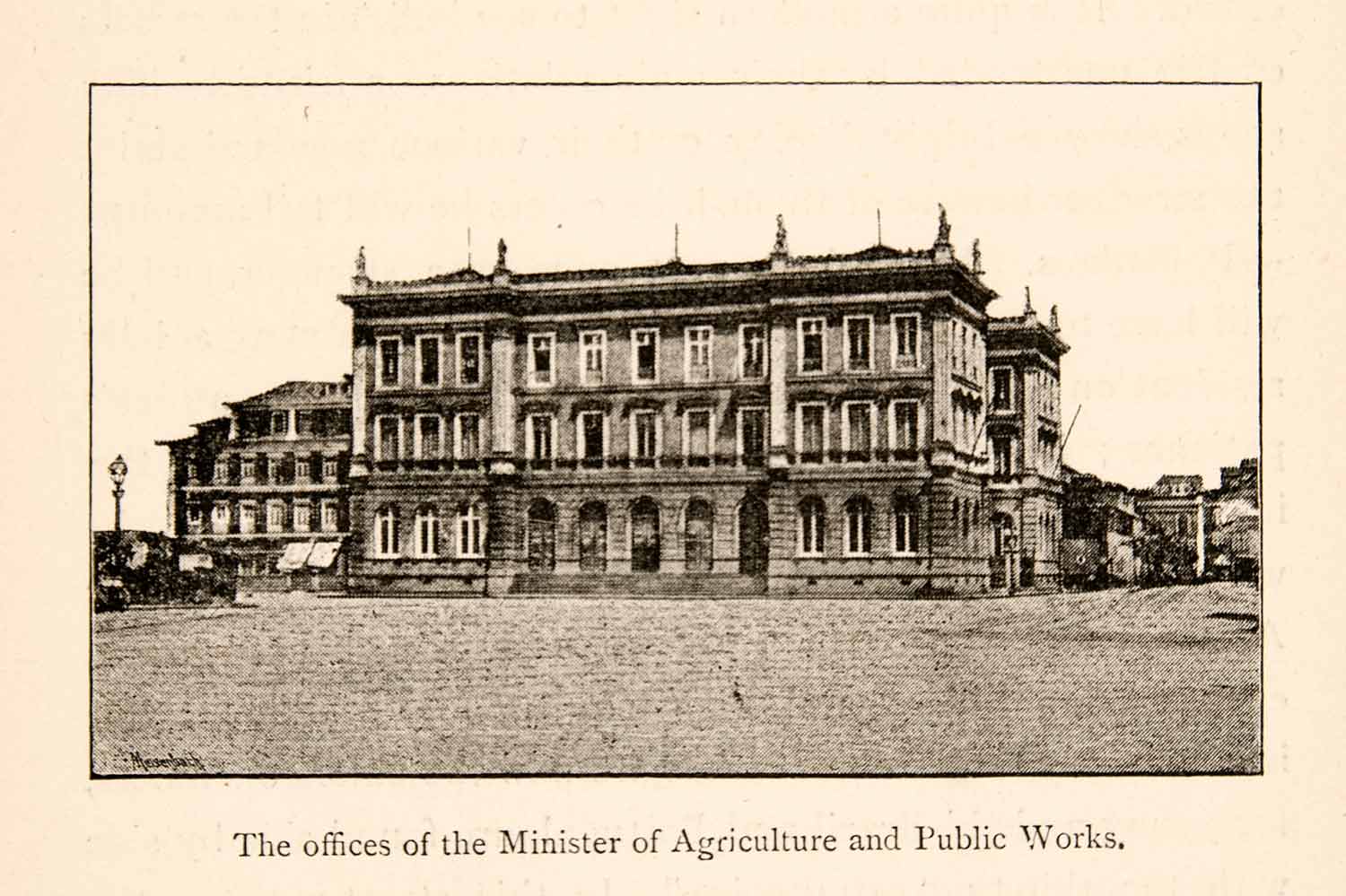 This is an original 1886 black and white halftone print of the offices of the Minister of Agriculture and Public Works in Brazil.