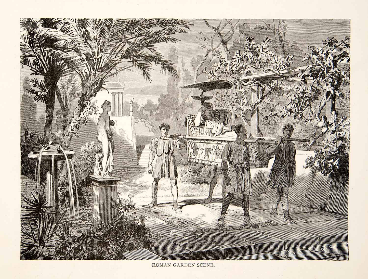 This is an original 1886 black and white in-text wood engraving of an ancient Roman being carried on his litter through a garden.