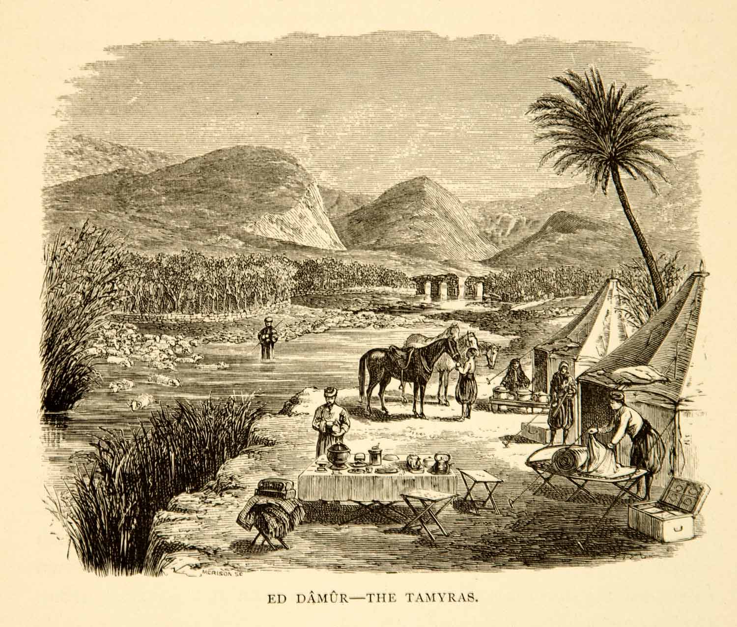This is an original 1886 black and white in-text wood engraving of artwork that depicts an encampment along the banks of the Damour (Tamyrus) River in Lebanon, Middle East.