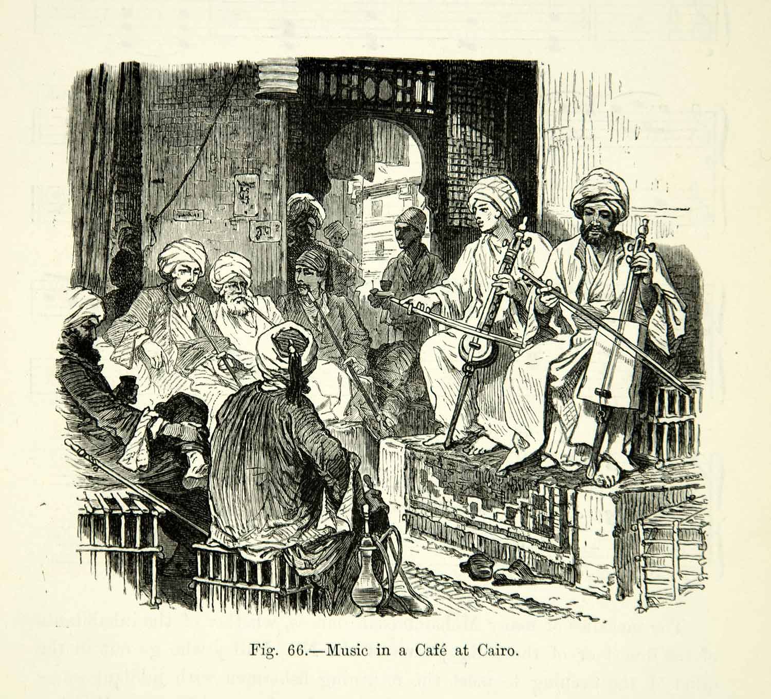 This is an original 1886 black and white in-text wood engraving of artwork that portrayed a group of Egyptian musicians playing the rebab and kemancheh in a cafe in the city of Cairo, Egypt.